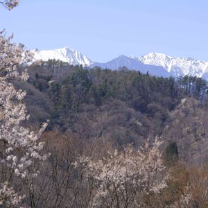 長野県池田町の桜仙峡から見る 山桜と北アルプス 後方の雪山、左から常念岳、横通岳、東天井岳