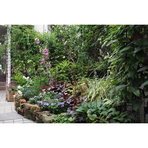◆いつもの箱庭 本格的な梅雨のシーズンに入り、それでなくとも鬱蒼とした箱庭はますます緑豊かな庭に変わっていきます。 入口にはダンスパーティ、ダークエンジェル(アジサイ)にギボウシ... 正面に刺し色と言うことでナスタチウムを置いてあります。