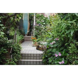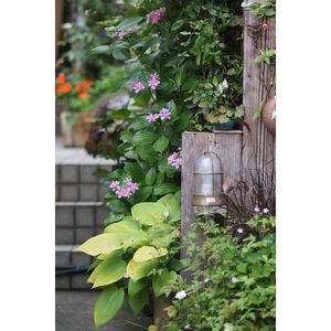 ◆いつもの箱庭 春先はペレニアルブラッシュ(蔓バラ)が咲いていた場所ですが、この時期の日当たりは梅の木の下になるので悪く、手前からギボウシ、アジサイなどを並べて、階段の上は多少は日当たりが良いので、メインになる花を寄せ鉢で置いています。
