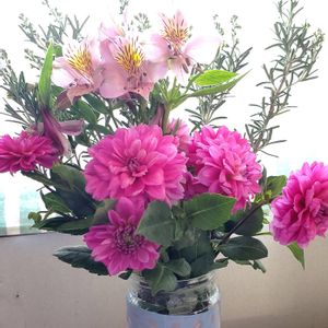 アストロメリアとダリア そして、白いラベンダー キッチンに飾った切り花♡