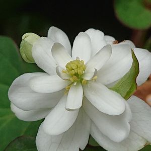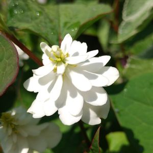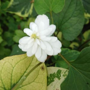 八重のドクダミ。 ドクダミ科 ドクダミ属。20年くらい前、薬草園を見学した際、おみやげに八重のドクダミを1本いただき、その1本の挿し芽から育ったものです。花が咲くまでは、一重か八重か区別がつきませんが、八重のほうが少しだけ咲くのが遅いような気がします。白い花びらに見える苞は、葉が変形したものとのこと。苞に緑色が混じっているものもあります。