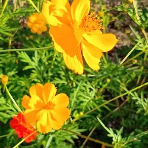 キバナコスモス(黄花秋桜)は コスモスよりも暑さに強く 開花期間も6月〜11月と長いです。 原産地のメキシコからヨーロッパを経て 日本に伝わったのは 大正時代ですが 本格的に広まったのは1960年代後半以降と言われています。 こぼれ種からも増える程 生命力が旺盛で 一度植えれば毎年お花を楽しめます。🤗✨ メキシコ原産。 キク科コスモス属の1年草。