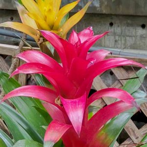 今日のお花グズマニアは 原産地の中央 南アメリカでは 樹木の幹や岩肌などに着生して生長します。 重なり合って四方に広がる艶のある葉に水を溜めて水分を吸収しているので 根は 吸水機能は 殆ど持っていないのだとか…。 赤や黄色の花のような部分は 葉っぱが変化した花苞(かほう)と呼ばれ 数ヶ月間 色褪せずそのまま残ります。 実際の花は 花苞の頂部にちっちゃく咲きますが 開花期間は短く直ぐ萎れてしまいます。 メキシコなど中央アメリカ 西インド諸島原産。 パイナップル科グズマニア属の多年草