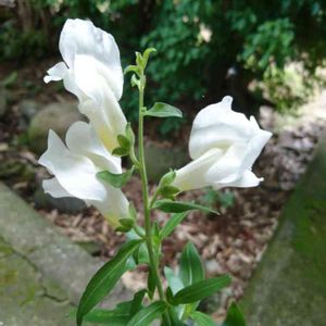 あなたは、どこからきたの? 1本だけコンクリートのヒビから伸びて何だろうと草かなぁ、でも花が咲くような葉っぱのような気がして放って置いたら金魚草が咲きました、しかも白です。植えた事はありましたが、白はなかったです。鳥かなぁ😊🌱