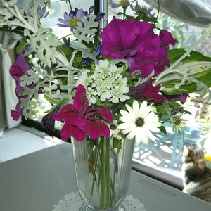 おはようございます☀ 年越しのペチュニア✂したので庭の花達と花瓶に飾りました🎶 種まきっ子のオルレア 都忘れ、ホスタの🌿 年越しの子達は😍 ベチュニアとオステオスペルマムの白💞 小さな庭の花達を部屋で楽しめるのは嬉しいです🥰