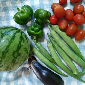 今日も暑い日でしたが今週は雨☔予報が出てます 植物も人間もカラカラ、☔降って欲しいですね 💛ミリオンベル カリブラコア こんもりレモン🍋…レモンよりちょっとグリーンががった爽やかなカラーです 💛🧡❤️畑のマリーゴールド‥種まき組 既に30㌢位の株に〜 コンパニオンプランツとしてバジルと共に市民農園には皆さん植えてますね🌿🌿 🍆🍅🫑…今朝採りの野菜 今年は長ナスを植えました、柔らかくて美味しいですね〜🥒は知り合いにお裾分けしました