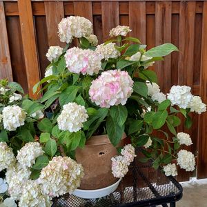 紫陽花の白寿紅 ①親株の白寿紅ですが花が茶色く傷んでるのがほとんどです。 ②からは挿し木の白寿紅、、茶色くなって花が散ってしまったのもあり 上手く育てられません。