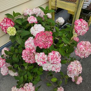 紫陽花 色々です🌿 ①恋物語 室内に置いています ②名前不詳 花びらがギザギザ ③茜雲 昨年挿し木 ④ダンスパーティー ⑤白寿紅 下はコットンキャンデ ィー 白寿紅が色付き始めています 🌿🥰