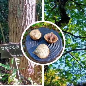 昨日の オニグルミ鬼胡桃に続いて くらべっこ 1つ目 ヒメグルミ 姫胡桃 クルミ科クルミ属の落葉樹 在来種 北海道~九州に分布 オニグルミの変種で、果実がより小さいので、お名前に『姫』が付けられました。 オニグルミよりも 果実の殻が割りやすいため果樹として普及し栽培されています。 果実はオニグルミよりも丸っこく、大きさは 2.5~3.5cm 鬼グルミは 殻が硬くゴツゴツ 姫グルミは 殻が滑らかで薄く割れやすいのが特徴です。 撮影 2023 9/17 小石川植物園 ★ 食べて遠くへ運んでシリーズ ★ お姫さまコレクション お名前に 『姫』がついているものをコレクションしています いろんなお姫さまがいるんですよ。よろしければ、タグ🏷️からご覧下さい 2つ目〜3つ目 ノグルミ 野胡桃 クルミ科ノグルミ属の落葉樹 在来種 東海地方以西〜九州に分布 日当たりの良い林縁に生える 小石川植物園で出会いました。 上見て、下見て、キョロキョロ歩いてると、ハリネズミ🦔みたいな松ぼっくり?が落っこちてました。 どの木から落っこちたのかな? 名札付きの木が直ぐに見つかりました。 『ノグルミ』 へー?! オニグルミやヒメグルミとは 姿が全然違うんですけどね~ クルミ科の仲間なのだそうです。 果穂は 長さ2〜3cmの卵状楕円形。 苞が密に重なり 苞の間に 翼を持った平たい 5mmくらいの堅果が付いてます。 熟すると苞が開き 1つずつバラバラ落ちながら 風に吹かれ旅立ちます。 松ぼっくりと同じですね〜 撮影 2025 10/12 小石川植物園 ★ 翼で 飛ぼう シリーズ 種子散布方法別に分類し シリーズ化しています。コレは風散布の内、種子が翼を持っているものです