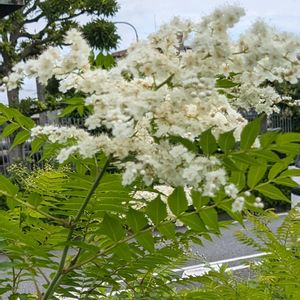街路樹と街路樹の間に白いお花のナナカマドが咲いていました。 この暑い時期に北の寒さに強いナナカマド大変ですネ