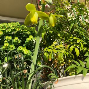 今年の新春売り出しで、オザキフラワパークで買ったアルブカ。 激安だったのに会員価格が、いつもより安く、花は来年かなと思っていたのに、花が咲く。😊 追伸、バックの写り込みは、御勘弁ください。