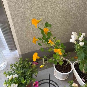 今日のお花、キンレンカ🍀 こぼれ種で、簡易温室からニョキニョキ🌱 小さな蕾もついてる😳 咲いてくれるかな🤔