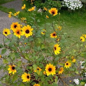 おはようございます。 ヒマワリ、 サンビリーバブル ブラウンアイガール。 今朝の様子。 少々暴れています。 裏側に花が咲いていたので、鉢の向きを、180度回してみました。 上の花が、反対向きに、なりました。 昨年は、9号鉢に植えたので、こんなに、暴れてはいなかった。 マメに、お世話していきたいです。 今日は、5輪ほど、咲いています。 長男宅の玄関脇にいます。