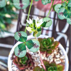レティジア の花と クローバー🍀 去年枯れかかったクローバーは お花も咲いて盛り盛り育ってます。 レティジア のお花は この後直ぐにカットしました✂️