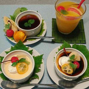 〃^_^〃♪毎日!暑い(;´д`)日が 庭先の草花も、夏バテ気味! そんな中のミントの葉や金柑、葡萄の葉など あしらってデザートなど作って見ました〃^_^〃 プリンを作って見ました♪ 冷たく冷やして、頂きました〃^_^〃♪ また、太る(ノ∀`)アチャー