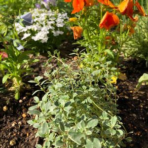 【タイム・ハイランドクリームの植え替え】 根本の茶色い葉は良くない状態なのかがわからないけど、ひとまずもさもさに生茂っていた分を間引いて、茶色い葉は取り除いた。小さな赤ちゃんタイムが親株の脇から生えていました。 植え替え後の発根促進剤を少しあげました。 こちらは梅雨入りしたところですが、 長くたれた葉っぱも刈り込むべきなのかな? 加減がまだわからない初心者です
