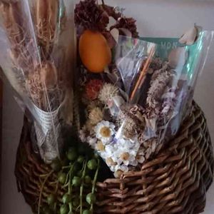 家で咲いたラベンダーや花かんざしのドライフラワー。 ブーケくらいの大きさでカゴに入れて飾ってます。