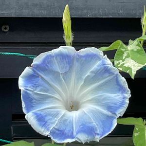 朝顔 遂に染め分け(大輪)咲きました。 これまでは真っ白でしたが、初めて青白染め分け💙🤍 受粉して目印つけました。 この種は数年前の種。 真っ白もいいかと思ってましたが、やっぱり嬉しいですね。 昨日蕾に青も見えたから楽しみに開花待ちました。 昨夜、雨に当たらないように軒下に移して、起きると直ぐ確認に出ました。