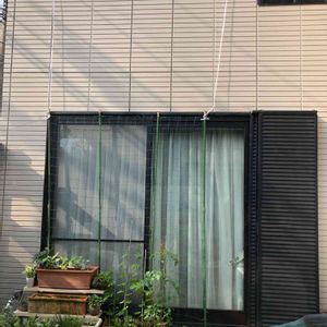 中庭のネット張りました。 左側3段朝顔 右側ゴーヤとトマトです。 トマト🍅は孫のちびちび姫が大好きなので成長していく楽しみがあるかと思ってます。 取り敢えずゴーヤはネットに届きますが、朝顔は芽切りしたばかりと、本葉も出てない状況です。