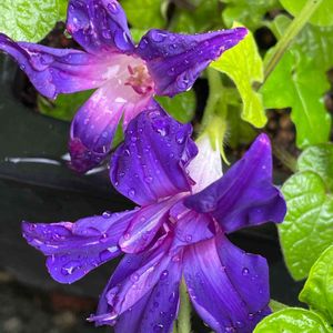 今朝の朝顔 下は昨日の朝顔 上が今朝開花した朝顔 加工無しでこの色。 昨日の朝顔が綺麗。