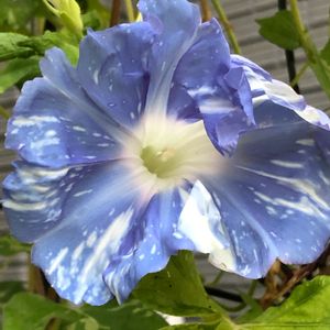 お早うございます。 今朝の朝顔 暁の露 遅く植えたから咲かないかと思ってましたが漸く小ぶりな2輪咲きました。 今までは変化してしまった暁の露のpicでしたが。今回は普通の暁の露。 台風の雨に濡れました。
