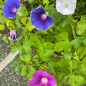 朝顔 桔梗咲き 久しぶりに3色揃いました。 桔梗咲きのツルはやたら太くて丈夫。 花も沢山付くので1本植えたら充分です。
