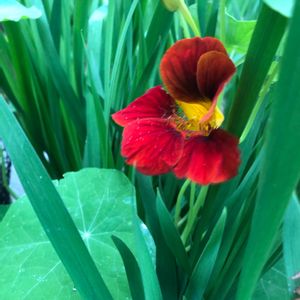 凄い雨☔️です。。。 雨が降る前にお庭に行って良かったー Rebornを繰り返し種蒔きしている ナスタチューム ブラックベルベットです。 2ヶ月程前に種蒔きし、やっと咲きはじめてくれました。 五寸あやめの中に埋まる様に咲いていましたよー。 黒ずんだ赤が魅力のブラックベルベットです。これからどんどん咲いてくれます。 沢山咲いてきたら、サラダ🥗のエディブルフラワーに使います^_^💜💕❤︎