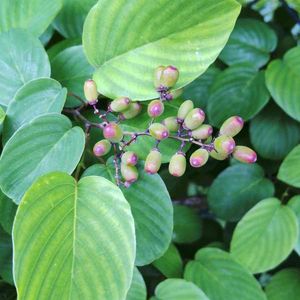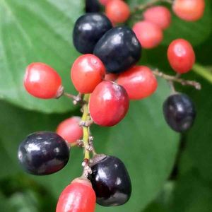 クマヤナギ(熊柳) 在来種(日本固有種) 北海道南部〜九州まで分布 クロウメモドキ科クマヤナギ属。 つる性植物で、葉は秋になると黄葉し、落葉して冬を越す。若い葉は食用になる。 果実は緑から、翌年の7月頃に熟して次第に赤になり、その後は黒く変色する。 果実が熟す頃に新たな花が咲くので、花と果実を同時に見ることができる。熟した果実は鳥の餌となる。 写真は、別々の場所で見た花と赤い果実。 どちらも花と果実は同時には見られませんでした。 花期7-8月