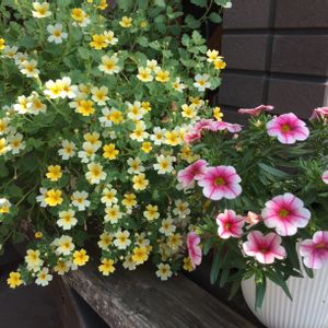 暑いけどお花たちは元気で〜す❣️ 奮発して買った少しお高めの苗だからか←あくまでも私のレベルです(笑) この灼熱地獄の中でもよく咲いています😍 いつまでも覚えられない名前💦 ジャメスブリテニア ゴールドスター🌼 カリブラコア カリプッチ ローズベイン🌸