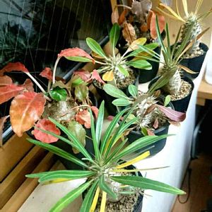 綴化ドルステニア・フォエチダさんの鉢に入っていた(綴化ではない)こぼれ種の芽を植え替えて一ヶ月。やっぱり一つは斑入りでしたが、お迎え時からこの子だけ徒長してて、植え替えて直ぐ双葉が枯れ、他の二つとこんなに差が出てしまいました。 塊根になる気配なし! どうせならこのまま枯れずに、面白く育ってくれないかなぁ。