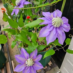 【クレマチス ディアマンティナ】 植え付けました💜 巻きつけるのが難しい💦 茎折れまくりだったけど茎生きてる? 大丈夫なのかな? ちなみに真ん中の赤色はサルビアです😆 隣の鉢です😁 目の錯覚でクレマチスの中にありそうだね😂😂😂