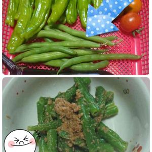『いんげん』 まずは直ぐ出来る定番の ゴマ和えですよ‼️ 私は黒胡麻ではなく白胡麻で 何時も作ります👍 黒のほうが少しだけ栄養素が高いのですが見た目が……… 食はまず見た目からですよね❗ って偉そうに言ってしまいました( *´艸`) 新鮮ないんげんは茹ですぎないことが大事ですよ‼️ パリポリが好き✌️