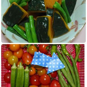 『ミニトマト』 『いんげん』 『オクラ』 『伏見甘長唐辛子』 今日の収穫です‼️ 甘長唐辛子が沢山💦 なに作れば良いかな⁉️ う〜〜〜と………😅 (色々と考え中😥😲😭)