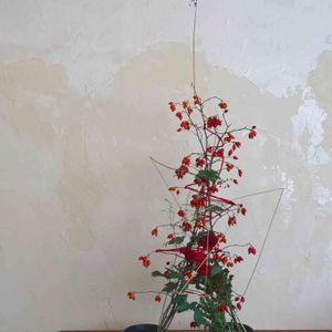 レッスン生徒さんの作品。 、 剣山など花留めは使わずに、 スズバラと異素材である毛糸を使って 自立させ、花留めとしました。 、 最後にドライのフトイを使ってアクセントに。 . そして私はまさかのギックリ腰に😅