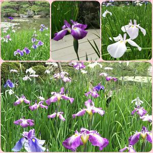 平安神宮神苑は、約10000坪の広さの池泉回遊式庭園です✋ 日本庭園の池が似合う💜花菖蒲💜のお花が咲き誇っていました😍💞 左上のpic、池の石の上には、アオサギが写っていますよ😊
