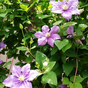 クレマチス・ジュエリーローズが盛んに咲いてくれています。こちらは地植え。この季節だけ、両端に高い支柱を立て麻紐で格子状にし絡ませてあげます。もう…高さも限界💦ですが、丈夫で一面にたくさんの花を咲かせてくれます💜🌱