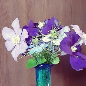 たくさんお花をつけている3種類のクレマチスと、ニゲラを飾りました。 この色合い、なかなか可愛い✧°˚˚٩(⁎ᵕᴗᵕ⁎)۶˚˚°