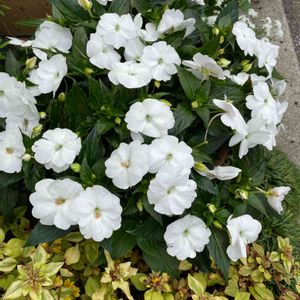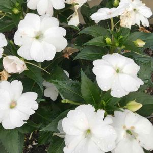 サンパチェンスが咲いてきました♪ お花が強いです! 昨日の豪雨に晒されても傷んでいません。 白いお花なので傷みが目立つと汚く見えてしまうかな?と心配していたんですが、ほぼ大丈夫でした🙆♀️ 丈夫で初心者に嬉しいお花です。 6号鉢が見えなくなるくらい大きくなってきたので8号鉢に鉢増ししようと思います😊