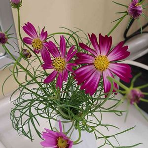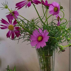 こんにちは👋😃 種蒔きからのコスモス。 6月から咲き始めて、真夏は休み休み咲いていました。 なかなか、まっすぐに、伸びてなくて草丈は、1.5m、台風で、一部倒れて折れてしまいましたが、頑張ってくれていて涼しくなってから、花数も増えてます。 また、台風で、傷む前に切り花に、しました。 オリヅルランも、ランナーからの小株が、たくさん出ていたので、一部カットして、整えました。