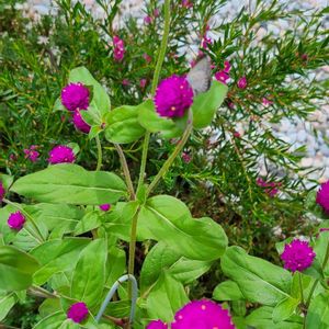 こんにちは👋😃 種蒔きからの千日紅 白い花も咲いてきました。 定番の赤紫、薄いピンク、白と、3色が、咲いています。 伸びて倒れた枝茎は、カットして切り花に、しました。 花が、まだ、小さなものが、多いです。