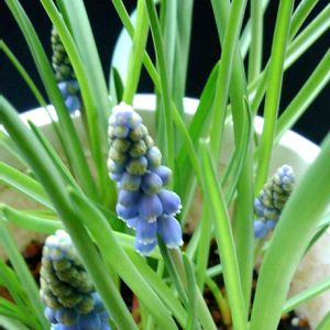 球根から育てたムスカリ 少し青い色が見えてきました