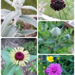 今日の庭パト🍀 ⬆️とうとう!ナゾノクサに花芽がついた!あなたは一体ナニセージ? ⬇️渋い色のジニアの咲き始め😍これから変化するはず。 ↗️黒っぽいスカビオサの蕾。枯れてない…よね?😨 ➡️桔梗😆周りに色々植えられてもちゃんと出てくる子。 ↘️えーと、ずっと壁紙にしてるこの子のお名前は…🙄調べたら宿根アスターでした。 もっと秋に咲くのかと思いました😅