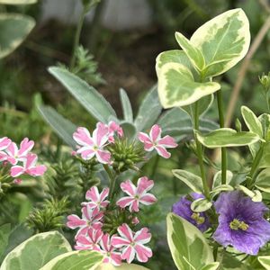 可愛い小花たち ①メカルドニア 丈夫で暑さに強いし自然にふわりと茂ってくれます♪ ②花ほたる 種とり用に見切り苗🌱を購入したが種が出来てるのかわからない😅 ③ニーレンベルギア 挿し芽株を6株植えてます。後ろは高性なのでどの程度高さが出るかな?