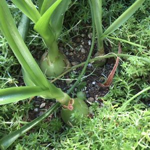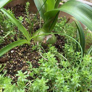 偽海藻の子供たちが、溢れて根付いてセダム群から、葉を伸ばしていたので、周囲のセダムは引越ししてもらいました。 いま2センチ位の玉葱です。