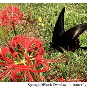 【季節の風物シリーズ:曼珠沙華に黒揚羽蝶】 ♧曼珠沙華:赤い彼岸花;Red Spider lily 🦋黒揚羽蝶;Spangle;Black Swallowtail butterfly 《一歌献上》 「*さやけしき 曼珠沙華に 黒揚羽」 @訳意; A black swallowtail butterfly has descended upon the bright, pure and refreshing red spider lilies. ;明るく清らかで爽やかな曼珠沙華に、黒いアゲハチョウが舞い降りました。 📖*さやけし;明けし、清けし、爽けし:「けし」は接尾語 ✍️Works;Poetaster Kazyan Doe.,/:筍歌人;藪中和堂 🖼️Artistic;Spangle on the Red spider lily flower /Kazyan’s Collection October 21,2025:past am 06:10';upload by Kazyan’s Green Studio