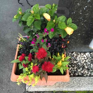 お山の車寄せにコンテナ作ったんです٩(๑❛ᴗ❛๑)۶ ケイトウやコショウなんかも入れて。 ちょっと秋らしいかなぁ〜❓ でもハイビスカス入ってるし😱
