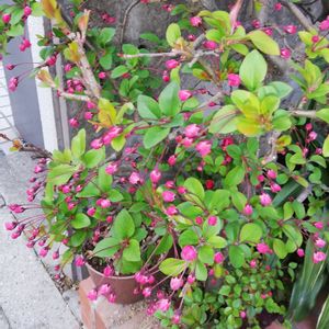 お隣さんのカイドウの蕾が膨らんできました! あんまり早くさかないでねー🙏 我が家のミニ林檎ちゃんが咲くまで待っててほしいの!何時も受粉させて頂いてます!今年は間に合わないかも?ー😅😆💐