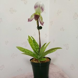 1枚目: 今年育った子株から出た花芽なので体力がなかったのか蕾が2個シケました。お花をカット✂️して楽しもうかな…ムラサキシキブのリップの色って本当に美しいと思う💜 2枚目: パフィオペディルム チャールズ ウォーシー 花茎が伸びてきた~楽しみ、楽しみ🥰 3枚目:バンダ グリーン ライト 連日の寒さに耐えきれずファンヒーター出したので部屋が暖かく2個目の蕾が開花してくれました❣️美しい黄緑色のお花とくるんꔛ⸃⸃とした距が可愛い😍