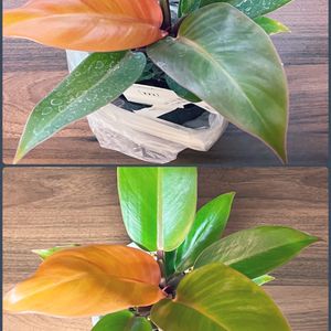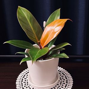 フィロデンドロン オレンジ王子の新葉💕 ほんとにきれいなオレンジです🥰 成長したらチョコレート色になってくのも可愛い🥰 でも周りの小さい葉っぱが何枚か黄色くなって枯れてしまいました😭😭😭 水やりすぎって情報見るけど、割とカラカラになるまであげてないんだけどなぁ…葉水もしないほうがいいんだろうか😭