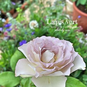 2枚目です(:D)┓ペコリンチョ 開花記録 17番目『ラピス ヴェール(ベール)』 切花品種で、すこぶる美しいけど、うちの庭の中では気難しいグループに属する。 パープル系の薔薇にありがちな、片方だけしか枝が伸びなかったり、黒点出しちゃうよΨ( Φ∀Φ)Ψィヒヒ。。。のようなアヤシイ葉っぱをチラ見せ。 私はファイターでは無いので💦できれば楽な子を育てたいのだけれど、この美人さんが、私に見切りをつけるまで、とことんお付き合いする予定。